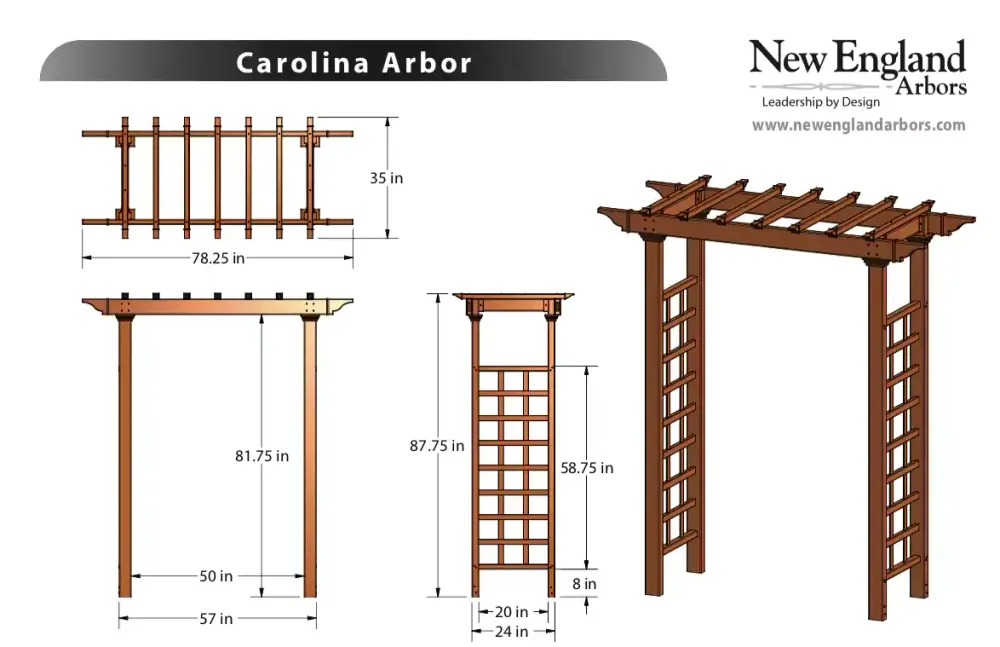 The Carolina Arbor is smart looking with a dramatic flair that sets you apart and defines the ultimate entrance-way to your property. Because it’s made of premium weather-resistant vinyl, the Carolina Arbor is virtually maintenance free. The Carolina arbor offers the natural, classic look of wood with all of the consumer friendly, maintenance free benefits of vinyl. The adjustable opening spans a sidewalk up to 50”.