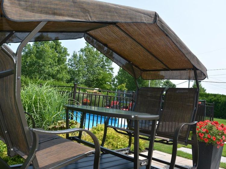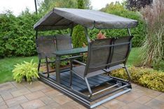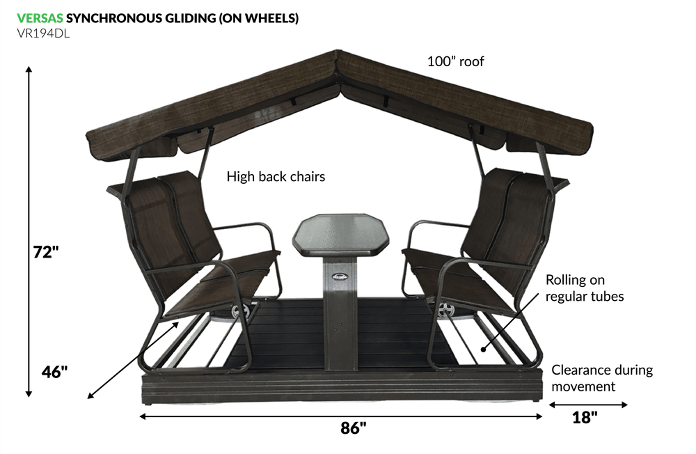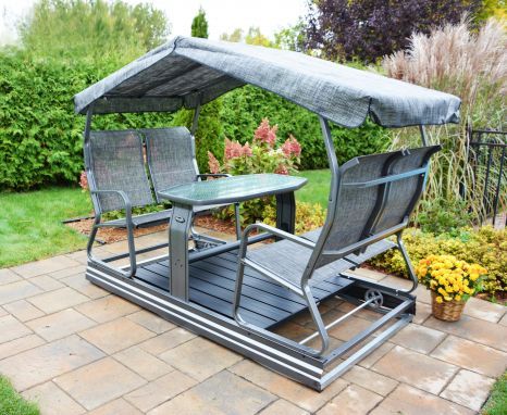 The entire unit glides in one motion. This garden furniture piece includes four comfortable, high-back chairs that let you rock and swing gently. The garden set has a glass table that provides a perfect place for meals, snacks and drinks. The frame floor is made of PVC for durability and weather resistance, and it rests on wheels that make it easy to reposition to any area in your yard.