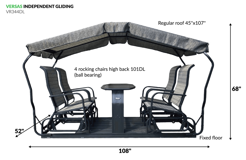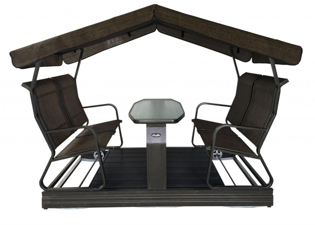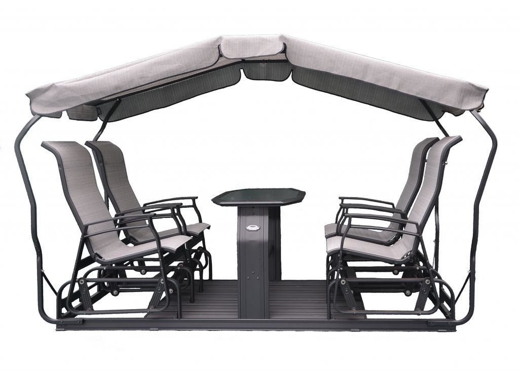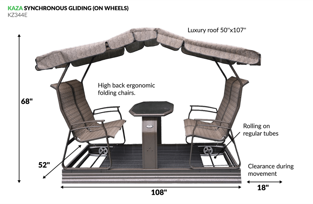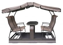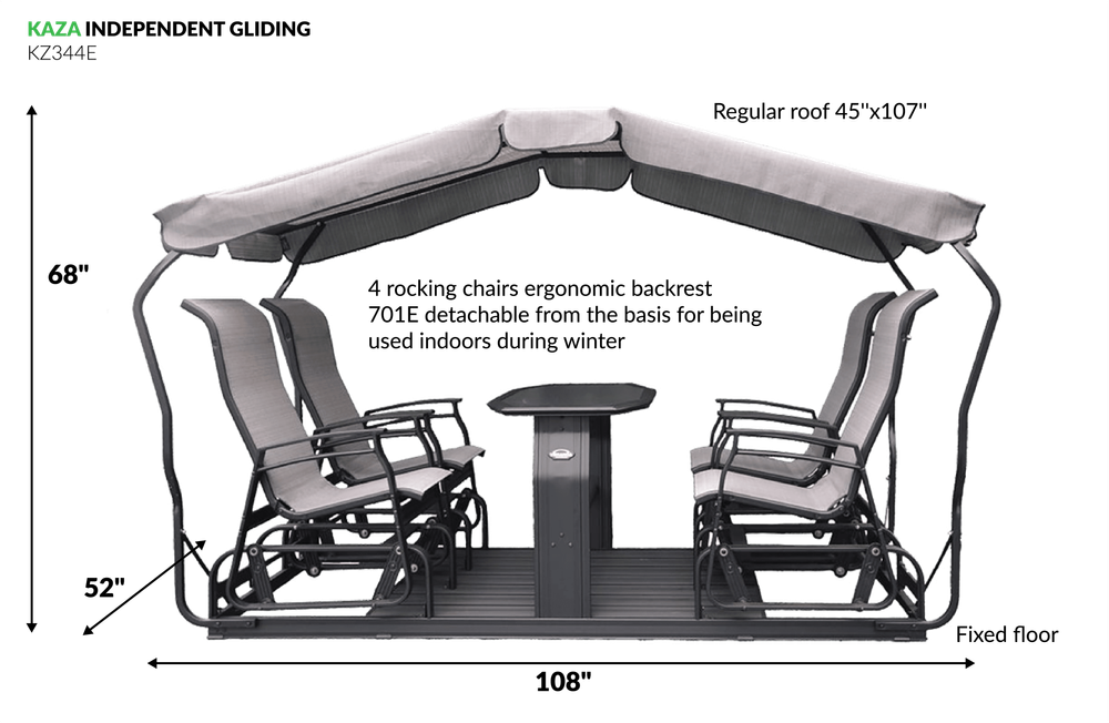 This swing consists of 4 oscillatory chairs 701L with high ergonomic backs that allow each person to swing at its own pace. Similar structure, style, table/chars as the swing on wheels with independeng mechanisms.