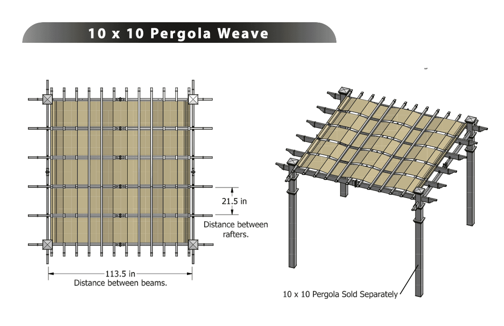 Each Kit comes with five canvas shades and everything you need to easily attach the shades to your 10 x 10, 12 x 12 or 12 x 16 pergola. Pergola not included.
