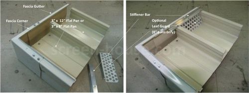 The images to the left offer a break down of the materials that complete a flat pan cover. The standard flat pan cover will include 4 sided gutter fascia, stiffener bars and fascia corners as shown. Optional leaf guards are also available.