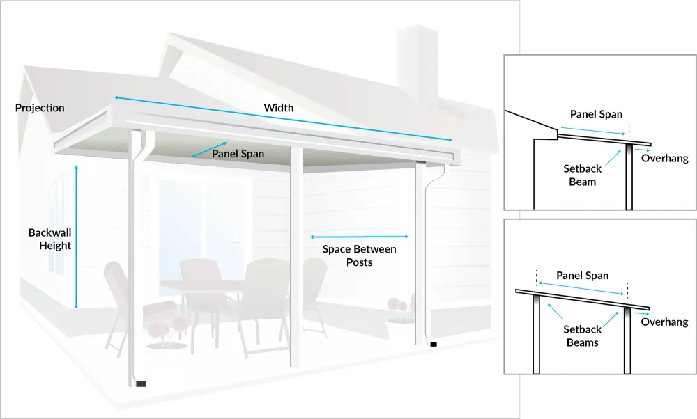 Note: 6" patio covers do not have an option for an integrated gutter. Drip edge fascia is provided for all sides and a residential gutter system can be purchased and installed locally if desired.