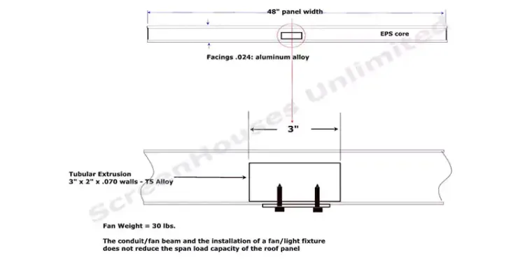 Fan beam panel provide a clean way to install lighting and fans. With the integrated conduit complete concealed inside the insulated panel, its easy to run the wiring and install the fixture like a professions. The roof panel is designed to hold the weight of a ceiling mounted fan up to 30lbs. Please note that the additional weight of the fan does impact the maximum span of the insulated panel which will be taken into consideration during the quoting process.