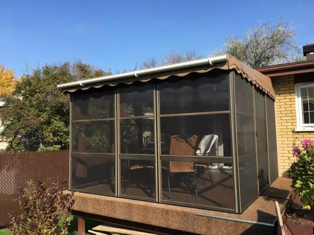 All Veranda Jardin home-attached screen enclosure kits have strong, maintenance-free aluminum frames and heavy-duty vinyl tops. Most screen enclosures are designed for three seasons and are the ultimate in low-maintenance patio rooms. The strong aluminum framing, with screens from top to bottom, provides maximum bug protection.
