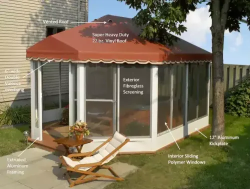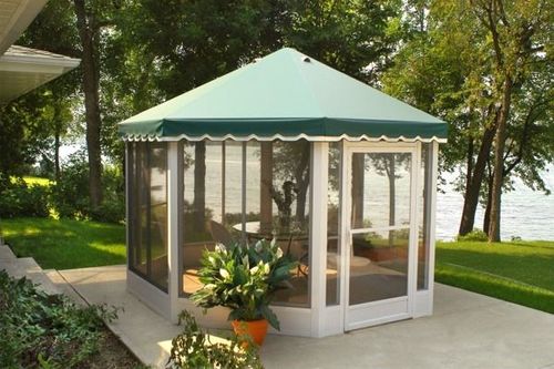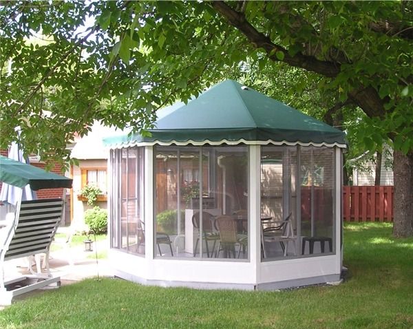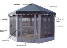 These enclosures are the ultimate in outdoor living. Perfect for your backyard gardenscape, the Carrousel gazebo kits can stay up all year round. They are designed to be secured to a deck or patio and come in a variety of roof colors and two frame colors. This is a great option for adding livable space to your house without the high cost of construction. It can also be disassembled and taken with you when you move.